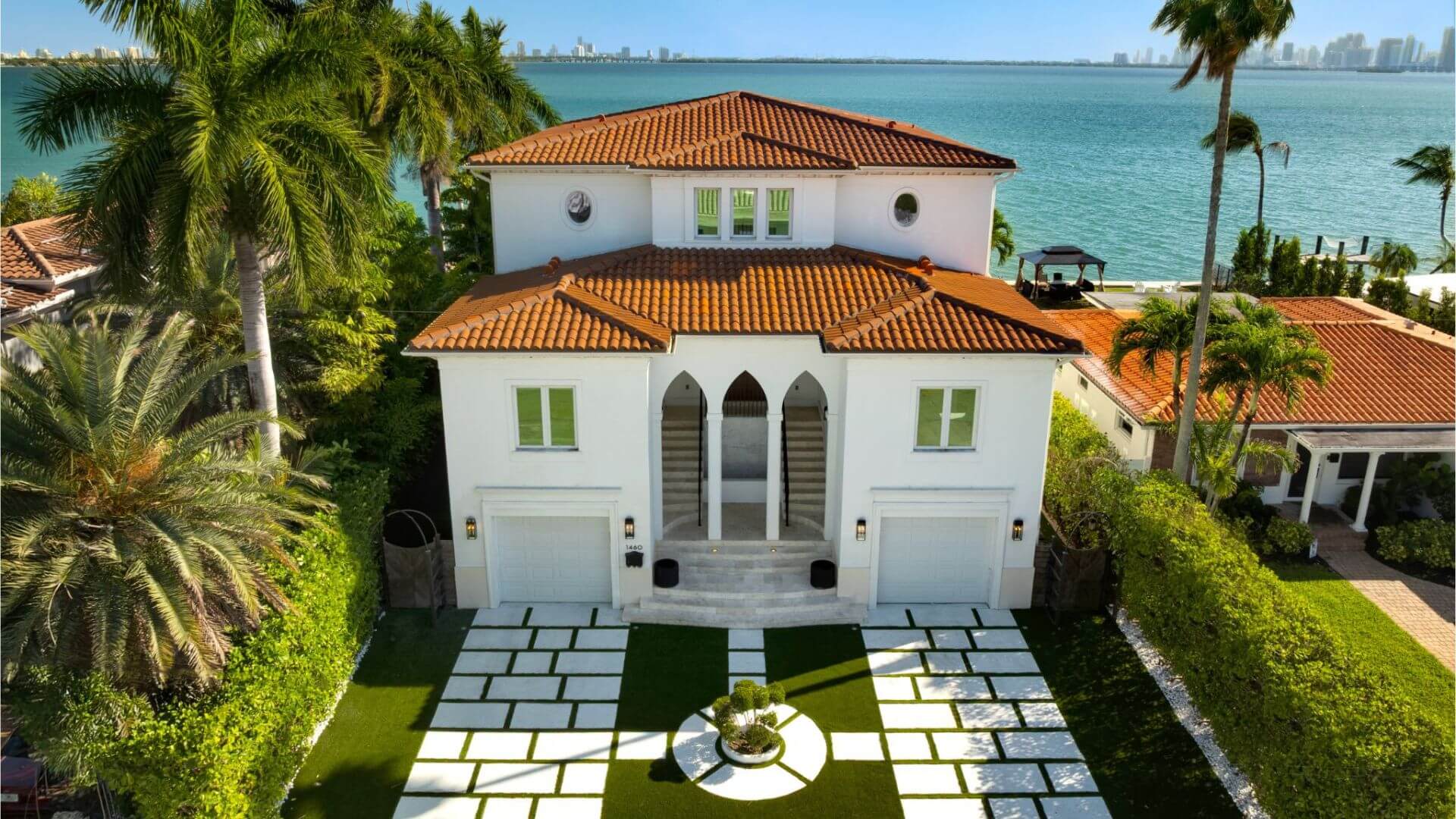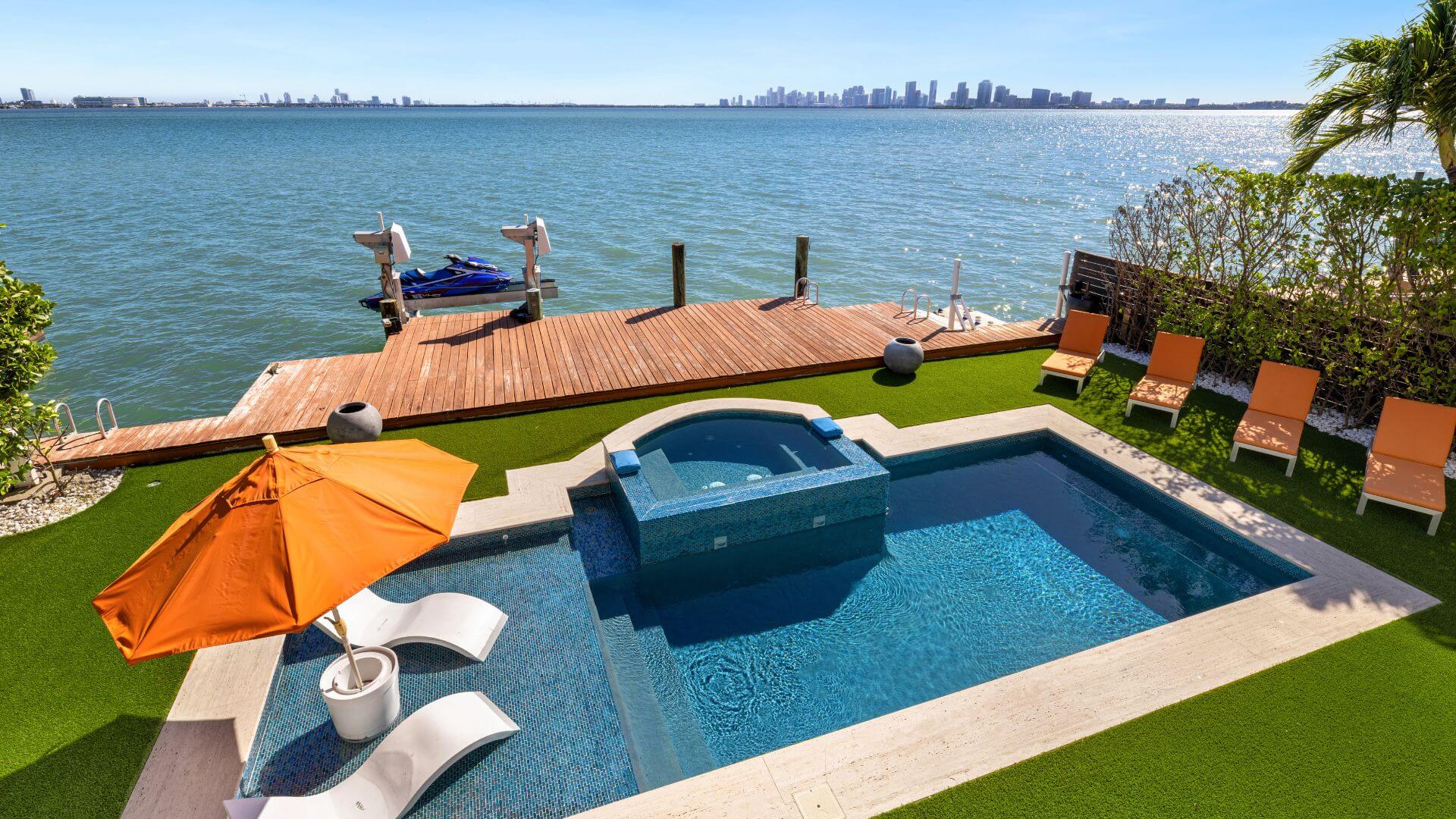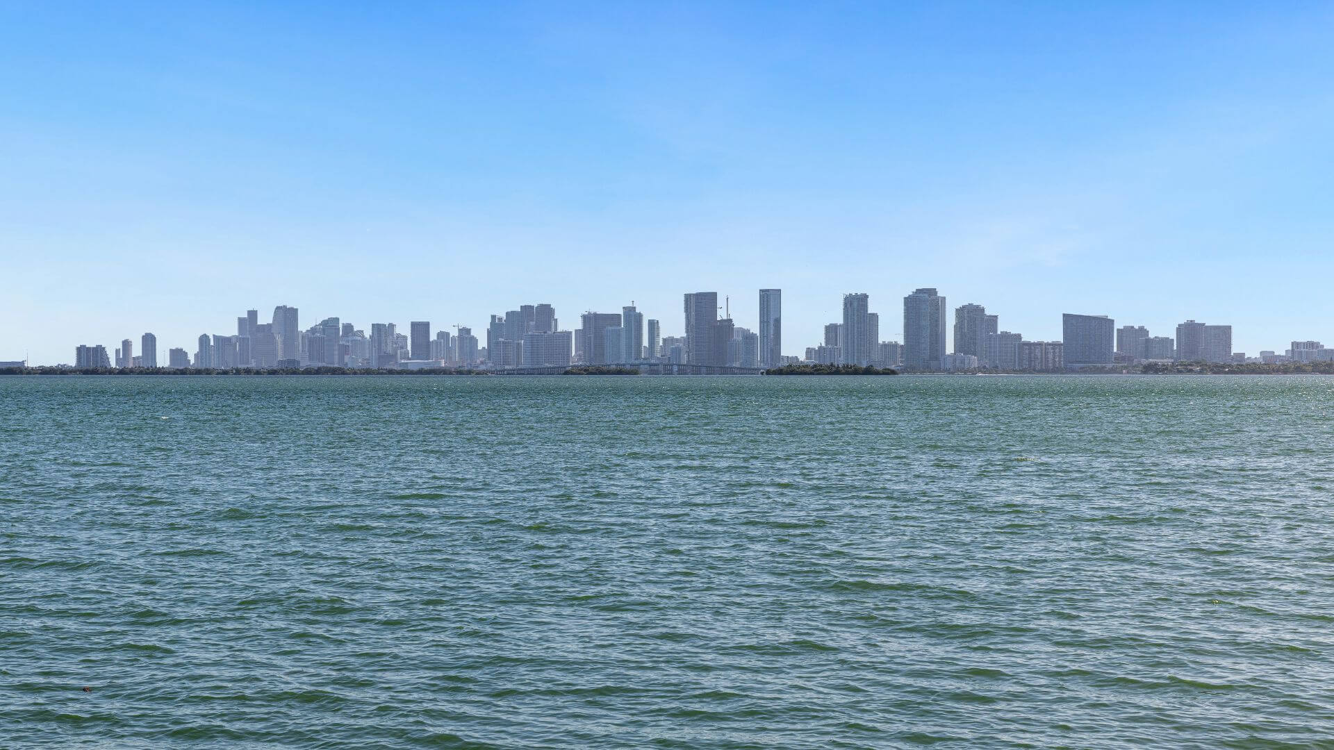 Island haven with sweeping bay and panoramic skyline views, a grand foyer, 6 en‑suite bedrooms, a chef’s kitchen and resort‑style terraces with a heated pool, 40‑ft dock and premium amenities including a theater, generator, 4.5 car garage and elevator that sits in between Miami Beach and Midtown Miami.